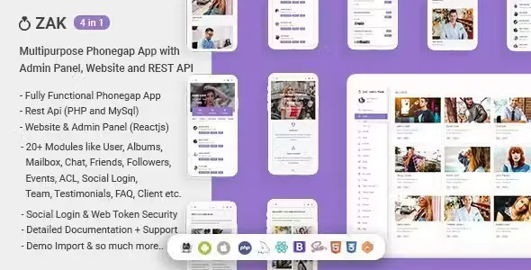 Zak - (4 in 1) Multipurpose Phonegap App with Admin Panel, Website and REST API can be used for various types of project applications. Various niche based SAAS projects can be made with this app, that make it complete one stop solution for all your needs. You can build both Android or IOS app with it.
