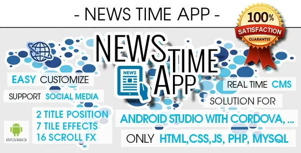 Support Android Studio with Cordova or Phonega Build Compatible platforms: Android (from 4.4 to latest). Compatible devices: Phones and Tablets; App code: HTML, CSS, JS, jQuery; Server side: PHP, MySQL database Push Notification 2 different text postions in tiles 7 unique tile animation effects 16 scroll animation effects Easily editable template Unique and beautiful design.