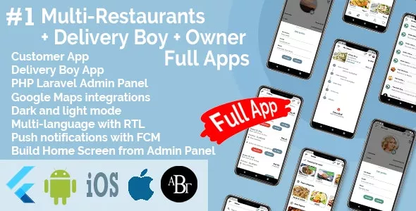 Multi-Restaurants Flutter App + Delivery Boy App + Owner App + PHP Laravel Admin Panel + Web Site