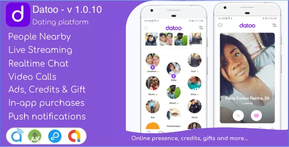 Datoo – Dating platform is a complete Dating App you need to get started your own business. It’s include Video Calls, People near with locations, Encounters, It’s a match, Live Streaming, Credits system, Admob, Realtime Chat, Premium features, Gift system in-app purchases, In-app subscriptions, Push notifications and more...