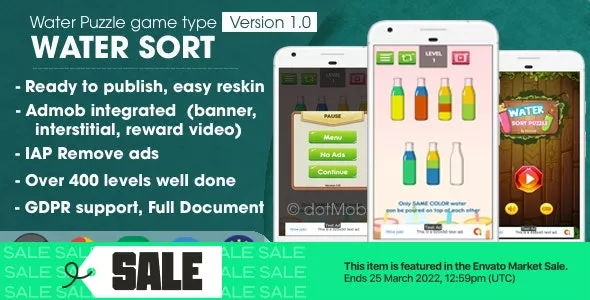 Water Sort Puzzle is a simple and addictive puzzle game. Use and storm your brain and try to solve each puzzle. This game helps you reduce time to build a similar game. You do not need to know any programming language to configure and use it. It is very easy to fill it with your own tasks, make UI changes, change your Admod ID start to gain experience in promoting your game and earning money. We will support you until you feel the most satisfaction for this asset.