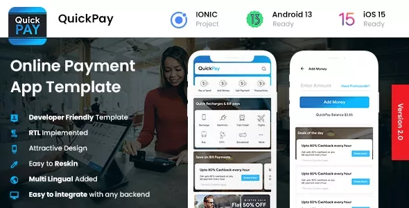 QuickPay is an online payment and wallet app for top-ups, online bill payments, ticket bookings and even online shopping. The Quickpay app can be a great choice for online payments, top-ups and bookings. This is a modern and highly customizable app template.
