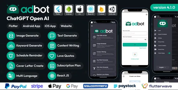 AdBot is a highly popular AI-based program that people use for generating dialogues. The chatbot has a language-based model that the developer fine-tunes for human interaction in a conversational manner. It’s a simulated chatbot primarily designed for customer service; people use it for various other purposes. Using the ChatGPT chatbot is fairly simple, as all you have to do is type in your text and receive the information. Premium features like that text to speech multiple language support configuration, speech-to-text multiple language support configuration, text share, image download, and share. However, OpenAI does require an account before you can use any of its tools, so if you don’t have one, you will have to register. Q: Do you want your personal and professional openAI chatbot Android and iOS Apps? This is perfect for you. It has also Google AdMob included, which is help to passive income. Get this software license for entrepreneurs and start-ups. Our main goal is to provide software to entrepreneurs at a low cost.