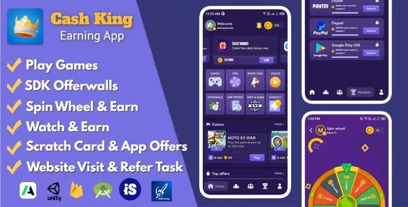 Cash King is a Android earning application with Admin Panel Back-end system that comes with App Source code for Free. There are many option available for earn cash. Like, user can earn cash via Play Games, Scratch card, complete task challenges & Offerwalls. Also earn with Watch Video, Complete offer, Spin wheel, Website visit, App Installs, Refer Task and Daily Bonus rewards. This application is build with Android Studio and we used clean and quality code for best performance with Unique UI Design that attracts Most users and already integrated with Ad Networks.