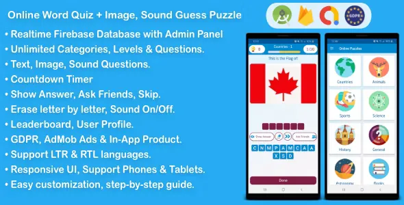 Online Word Quiz - Image Guess, Sound Guess Puzzle is an Android app that supports adding an unlimited number of categories and an unlimited number of levels inside each category with an unlimited number of puzzles inside each level, using an easy Admin Panel which connected with the Realtime Firebase database so you can update your puzzles online directly. Each puzzle support 3 format (text + image + sound) so you can use one format as (text only, image only, sound only )or you can use all formats together or making any combination between them as you like. The app is integrated with AdMob Ads and In-App product to remove ads.