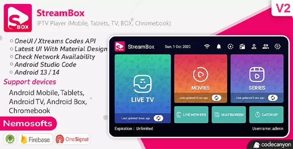 StreamBox is an IPIV Player can use for any hls links with m3u8, ts. Support xtream codes with all versions, Xui one 1.5.5 & 1.5.12. It have amazing featured video player inbuild for live tv and Vod. Using this application you can save your money and time in creating application for your own iptv mobile, tablets, android tv, android box. The application is specially optimized to be extremely easy to configure and detailed documentation is provided.
