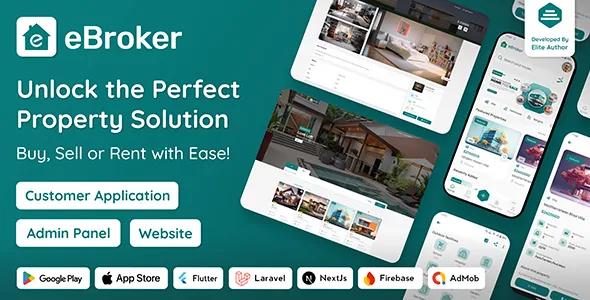 eBroker is a complete real estate app source code that includes a Flutter mobile app, Laravel admin panel, and a responsive web version.