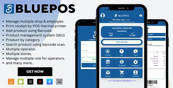 BluePOS is an android-based online cashier point of sale application with php admin backend API, with BluePOS you can make quick records for sales (Point of sale), manage customer data, manage inventory data, manage employees and access employee (roles), manage purchases (cost), manage stock, view complete reports ranging from sales reports, purchase reports, stock item reports, most preferred item reports, to profit and loss reports. You can also connect this application with a Bluetooth thermal printer to print sales receipts directly. BluePOS is also equipped with a data backup and restore system so that the database is more secure if problems occur on your device in the future. BluePOS is a solution for POS mobile android. FAST, FRIENDLY, FUTURE!