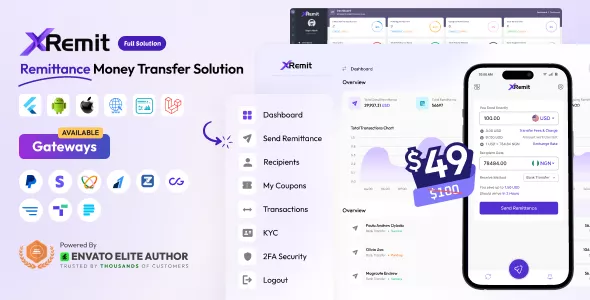 Introducing XRemit Pro, the all-in-one Remittance Money Transfer Solution that equips you to launch your remittance solution business effortlessly. With a comprehensive package including a responsive website, cross-platform Android and iOS app, and an intuitive admin panel, XRemit Pro ensures you’re ready for success from day one. While supporting Multiple currencies at a time, it offers a quick start for your venture. Seamlessly facilitate International Remittance, BANK DEPOSIT, and MOBILE MONEY transfers, while providing your customers with the convenience of Saved Recipient profiles and real-time Money Tracking. Ensure transparency with Downloadable Receipts, and tailor your gateways with Automatic and Manual options. Prioritize security and compliance with Email KYC Verification and robust 2FA Security, all while offering expert Live Support and a Support Ticket system. Choose XRemit Pro and transform the way the world sends and receives money. Your remittance solution business begins here. Get this software license for entrepreneurs and start-ups. Our main goal is to provide software to entrepreneurs at a low cost.