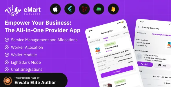 eMart - Worker / Service Man App for On-Demand ServiceService Provider App for On-Demand Home Services Complete SolutionHandyman Service - On-Demand Home Service Flutter App with ChatGPT IntegrationThinkin Services - On Demand Service App - Urbanclap CloneProhandy - On-Demand Handyman & Home Service Provider Marketplace PlatformDemandium - Multi Provider On Demand, Handyman, Home Service App with Admin PanelService Booking Android App - ServPro On Demand ServicesBelya - On Demand Service App, Customer & Provider Apps with Admin Panel