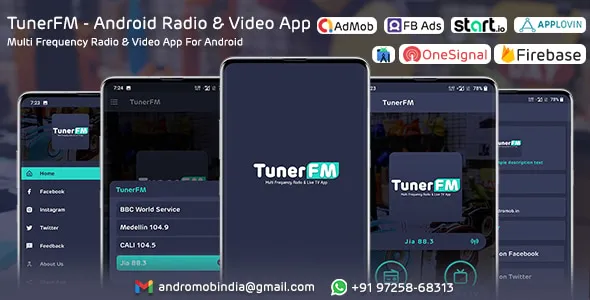TunerFM is an Multi Frequency Radio & Live TV Application For Android Platform, Android Mobile Application That Runs Online Streaming Radio, Live TV, This App Supports Almost All Formats m3u8,rtmp type link which is play live streaming and many other audio and video formats, This Application Is Specially Optimized To Be Extremely Easy to Configure And Detailed Documentation is Provided, You Can Easily Create Your Own Multi Frequency App With This Template.
