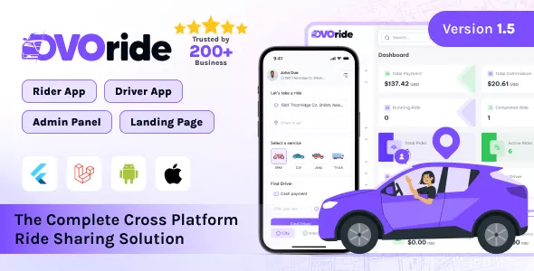 OvoRide is a comprehensive and user-friendly ride-sharing solution, ideal for anyone aiming to launch a feature-rich ride-sharing platform. Designed with Flutter for the Rider and Driver apps and Laravel for the Backend, OvoRide includes everything you need to run a successful ride-sharing service. From seamless booking and real-time ride tracking to flexible payment options, OvoRide provides an intuitive experience for riders, drivers, and admins alike. With powerful integrations such as Google Maps for navigation, Pusher for instant data capturing, and Firebase for push notifications, OvoRide is a complete solution for modern ride-sharing needs. The app is easy to set up, with clear instructions provided, making it accessible even to beginners. OvoRide is one of the most comprehensive ride-sharing solutions available on Codecanyon.