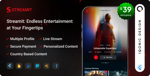 The Streamit OTT Streaming Flutter App with Laravel Backend is a powerful and feature-rich Flutter live streaming app with Laravel backend designed for seamless video and live TV streaming.