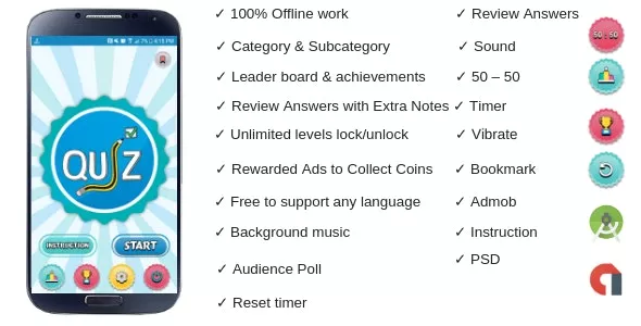 100% Offline Quiz Category & Subcategory Unlimited levels lock/unlock 50 - 50 (Fifty - Fifty) Audience Poll Timer Reset timer Review Answers Leader board & achievements.