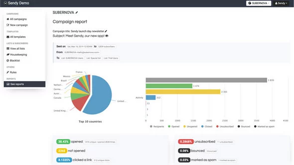 Sendy is an email messaging application that allows you to send tracked emails through Amazon Simple Email Service (SES).