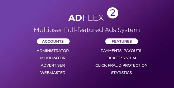 AdFlex 2 - Multiuser Full-featured Ads System Targeting countries, OS, browsers, device types (mobile, tablet, PC), categories Click-fraud protection 2 payments model CPC.