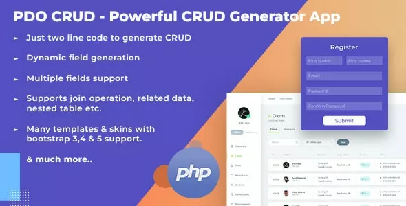 PDO Crud is a PHP CRUD based application. It supports Mysql, Pgsql and Sqlite databases. You can use PDOCrud to create the front end and backend of your application. With just 2-3 lines of code written, you can perform insert / update / delete and select the operation. You just need to create an object and call the render function on this table and everything will be automatically generated. The form fields will be generated based on the data type. You can delete fields, change the type of fields, and perform various types of customization. You can create forms directly from database tables in a few seconds by just writing 2-3 lines of code. All insert / update / delete / view code is script driven.