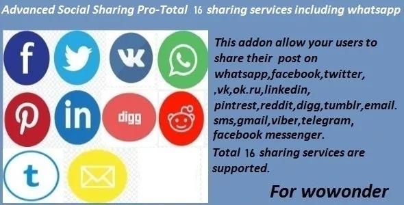 Advanced Social Sharing Pro is addon for WoWonder v3.1.1 & above. This addon allow your users to share their public post on whatsapp, facebook, facebook messenger, twitter, vk, ok.ru, linkedin, pintrest, reddit, digg, tumblr, email, gmail, sms, skype, telegram, viber. Total 18 sharing services are supported.