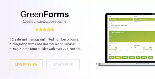 Introducing the most powerful and fastest WordPress form builder on the market. With Green Forms for WordPress you can create multi-purpose nice looking forms which perfectly match design of your website.