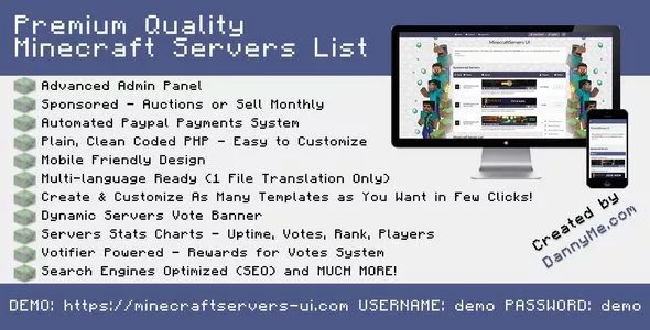Minecraft Servers List (CMS) is TOP quality, features rich Minecraft servers listing control management system. Which allows you to own and maintain premium quality minecraft servers project in minutes with no programming knowledge at all.
