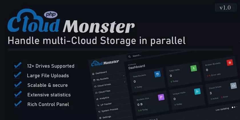 Cloud Monster is a PHP script designed to work with multiple cloud storages in parallel. Most of the list is devoted to uploading a file to several cloud storages at once.