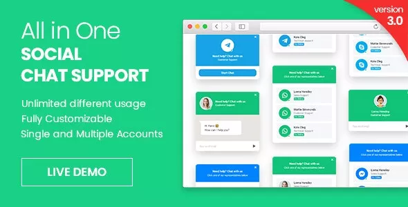 Social chat support plugin that provides a quick and easy way to interact with your clients. This plugin will allow your customers to contact directly to your support team.