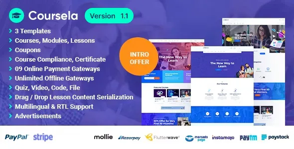 Coursela comes with 9 automated payment gateways & unlimited offline gateways for course enrolment - Paypal, Stripe, Mollie, Razorpay, PayTm, Instamojo, Flutterwave, Paystack, Mercado Pago. You can also see Enrolment reports of a specific duration & export it as CSV.