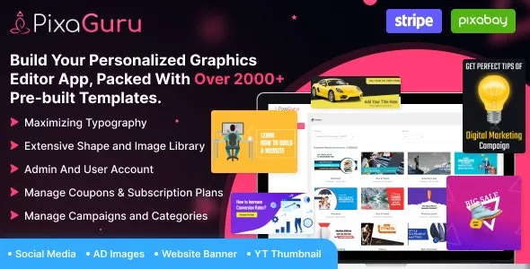 PixaGuru - SAAS Platform to Create Graphics, Images, Social Media Posts, Ads, Banners, Stories & Presentation is a user-friendly image editor tool developed using CodeIgniter technology. The tool is packed with over 2000+ ads, graphic banners, thumbnail images, and many more. It has really simple editing features that will make your work much more pleasant!