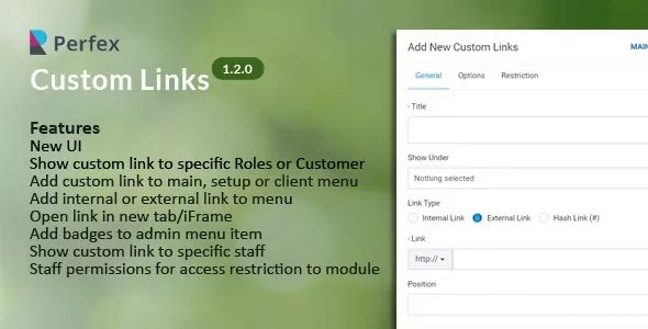 Custom links module allows you to add custom menu items in main menu and setup menu of Perfex CRM. It is small module helpful add quick bookmarks or your custom link in menu which can be quickly accessed.