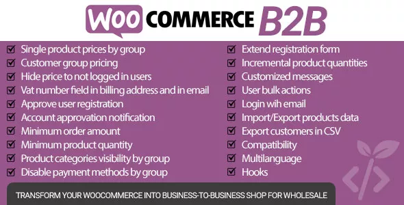 WooCommerce B2B plugin is a one-stop wholesale solution for your B2B or B2C customer groups. This system solution is based on a well thought-out design incorporating 5 of our top selling plugins, integrated with a couple of additional B2B features.