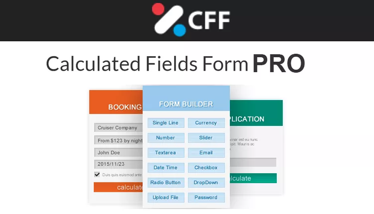 - Includes a form builder for adding / editing various types of fields, including one or more automatically calculated fields based on data entered in other fields.