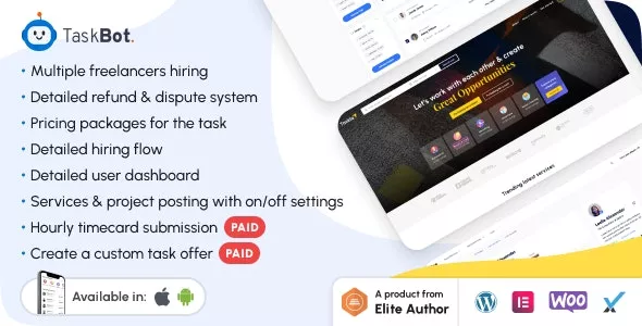 Taskbot is a freelance marketplace WordPress plugin that allows you to sell services / concerts online. This system will allow sellers and buyers to register and create their profiles in a few simple steps. Sellers can create tasks and receive online bookings for hosted services/concerts. It has been designed and developed after careful research to meet the requirements of people interested in creating a marketplace for sellers or other similar projects.