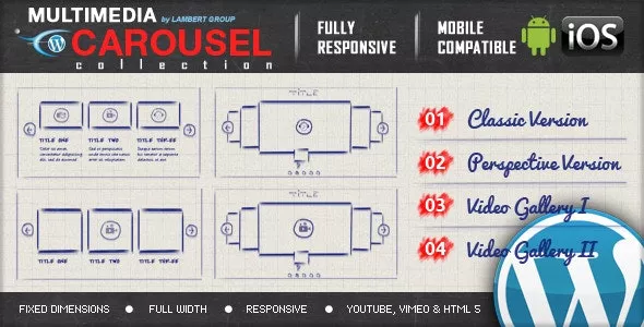 Multimedia Responsive Carousel WordPress Plugin comes in 2 versions: Classic and Perspective. It can also be customized as video gallery or audio gallery.
