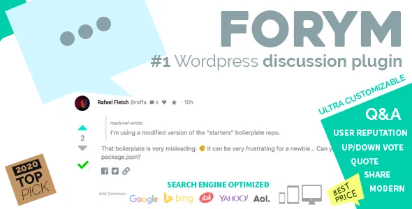 Forym (formerly WP Pro Forum system) allows you to add a clean and user-friendly discussion forum to your website. It has many powerful features to create a professional-looking forum / helpdesk / Q&A with ease!