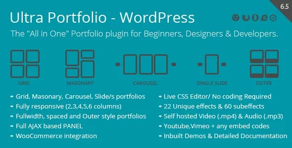 Ultra Portfolio is a WordPress plugin used to build portfolios in any desired layout with ease. Grid, Masonary, Carousel Slider, Single slide, Classic blog style, Full width, Spaced, Outer content, Above media content, Left and right side content etc. styles of portfolios can be built. WooCommerce seamless integration takes the plugin one step further.