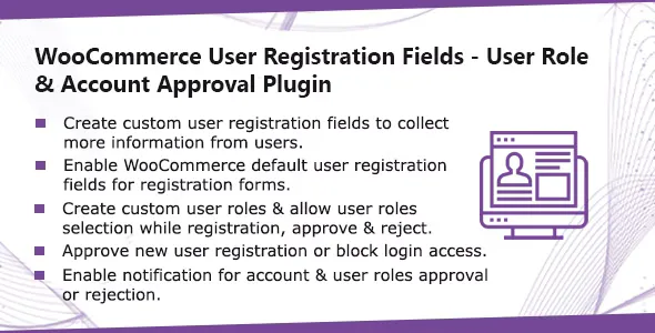 The plugin allows to add custom registration fields in user registration form for WooCommerce. The plugin also allows admin to enable / disable Woocommerce default registration fields in the registration form. Admin can create custom user roles using Wordpress native UI. Admin can allow users to request a user role while registration, users requested roles can be granted automatically or manually. Login access can be managed without deleting user accounts. Admin can activate or disable user accounts. Send custom email notifications for account enable, account disable and user requested role approval.