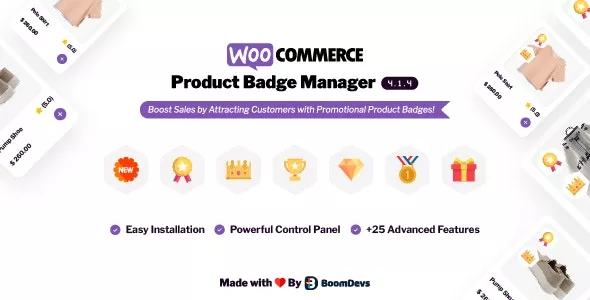 WooCommerce Product Badge manager lets you create unlimited product badges and assign them to your WooCommerce product based on category, attributes, terms, popularity, sale, time, stocks, etc, and filter products archive using badges.