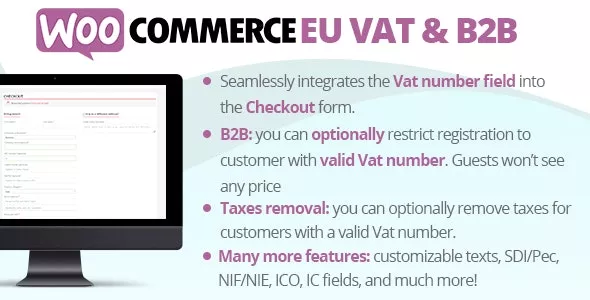 The WooCommerce Eu Vat & B2B (WCEV) seamlessly integrates an additional EU Vat Number Field into your WooCommerce platform. It will be dynamically shown during the checkout process only if the selected billing country is part of the European Union. The plugin also offers several other options, like a way to validate the field, make it as mandatory or to remove the Taxes if a valid Vat number has been entered. Optionally you make the registration process available only for business (B2B) with a valid Vat number!