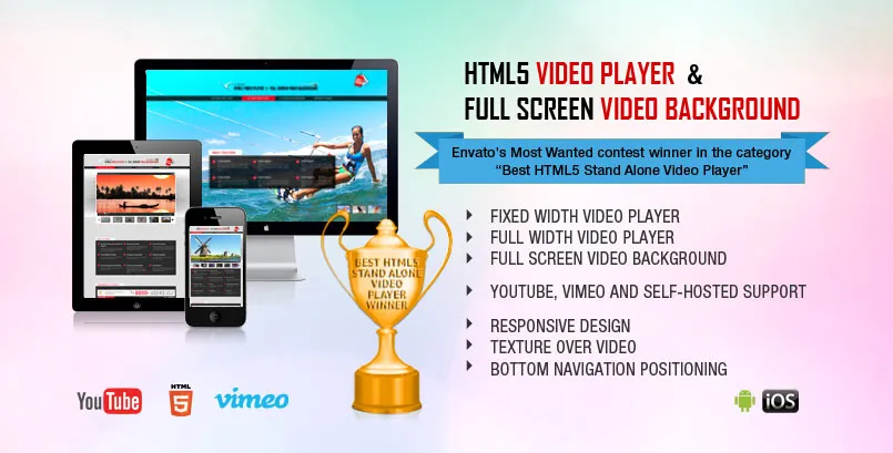 This HTML5 Video Player is ideal if you want a video player which will support YouTube, Vimeo and Self-Hosted videos.