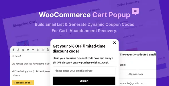 The WooCommerce Cart Popup plugin helps merchants effortlessly set up exclusive discount codes and interact with users through the popup. With the following 3 trigger events, it prompts users to enter their email and receive a limited-time coupon code. This not only expands the email list but also reduces cart abandonment rates.