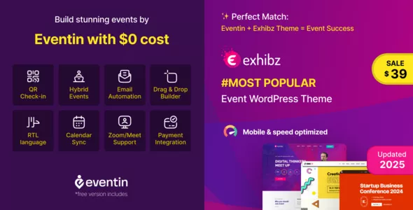 Exhibz is a Creative and Modern Event, Conference WordPress theme for organising meeting, Seminar, Food festival, Education conference, 2024 Event, venue, Single Event, Multi Event or any other kind of event. It comes with Drag and Drop Elementor Builder so you can easily customize everything you need. With Eventin Plugin you can Sell Online tickets Now.