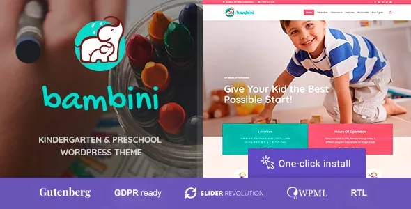 Bambini is a dedicated theme for a kindergarten, preschool nursery, day case and any other facility for toddles and children. This is a theme is a kindergarten & preschool WordPress theme that can be used for day care institutions, children groups, play schools, kindergartens and kids stores. A fully integrated and styled WooCommerce shop section lets you create a e-Commerce system for selling toys, educating materials and baby products.