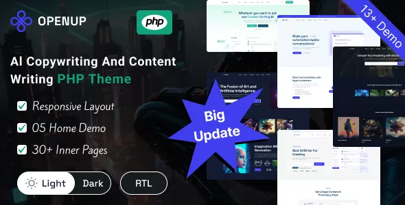 OpenUp is an exceptional and versatile WordPress theme designed specifically for AI Content Writing/Generator websites With its sleek and contemporary design, OpenUp is the perfect choice for building your own AI Writer, Copywriting, OpenAI Content Generator, Chatbot, and Voice Generator landing pages website.