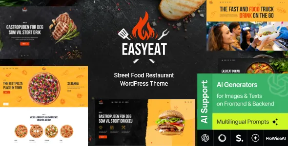 EasyEat is a stylish and modern Street Food WordPress theme. It is fit for all kinds of food business, such as food truck street food, restaurant, cafe, sports pub, bakery, food portfolio and gallery, online shop, creative bar, pizza place.