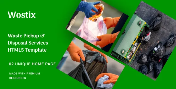Wostix - Waste Pickup & Disposal Services HTML5 Template is a modern and elegant page. You can use this template for develop your website like as cleaning company, house cleaning, trash & garbage pickup, recycling service etc.