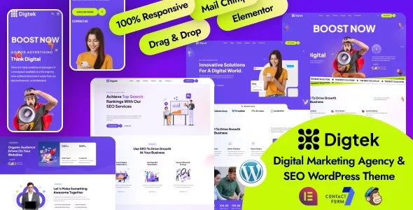 Digtek - Digital Marketing Agency and SEO WordPress Theme. Digtek is a best landing page for SEO, Business, Agency & Startup Company. This theme has creative layout, smooth animation, unique features, modern and unique design which make your website more beautiful. This Theme comes with 3 different home pages version and included 25 valid Inner pages. This theme easily customizable, fully responsive and support all modern browser and device.